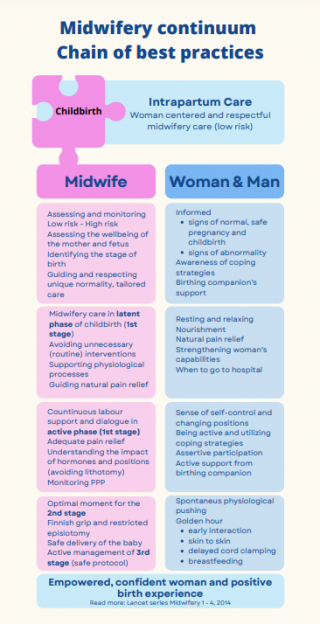 In this project we have developed chains of best practices for each step in full scope midwifery. Here’s the picture of best practices in intrapartum care. Click on the picture below for a PDF-version, that can be saved and/or printed for professional use: