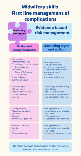 In this project we have developed chains of best practices for each step in full scope midwifery. Here’s the picture of best practices for management of complications. Click on the picture below for a PDF-version, that can be saved and/or printed for professional use: