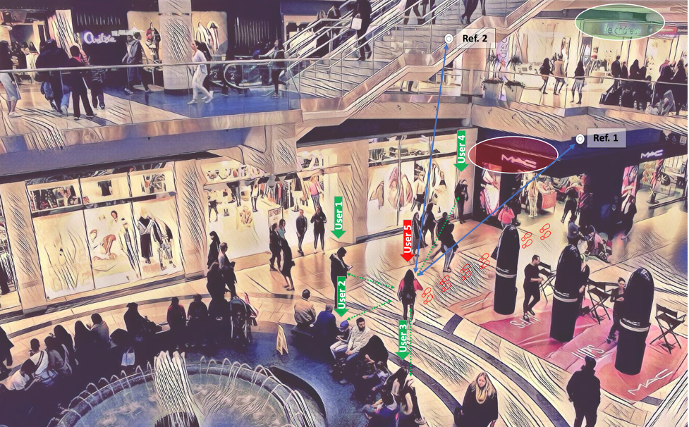 The figure below exemplifies a location and navigation scenario using collaborative positioning. Let’s imagine that we are in a large shopping center, and we want to find a store located in the east wing of the shopping center (le Château store, encircled in green). Therefore, using the signals emitted by the Wi-Fi routers and our positioning and navigation system installed on our smartphone, we start to navigate through the shopping center. However, when we arrive a few meters from our final destination, the number of Wi-Fi outers (Ref. 1 and 2 in the figure) does not allow us to accurately determine our location and guides us to the wrong area (MAC store, encircled in red). Fortunately, in that area 4 users (users 1,2,3,4) know their location with high precision because they use other position systems based on BLE (Bluetooth Low Energy) and UWB (Ultra-wideband). So, through the collaborative positioning system, and using the BLE communication they exchange and measure positions with us (user 5). A few milliseconds later, our system is recalibrated and informs us that Le Château shop is on the upper floor.