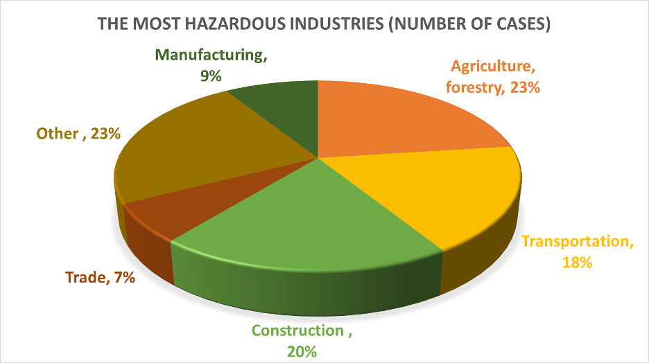 Currently, there are no global statistics of workplace accidents depending on the industry sectors. However, a row of countries such as Great Britain [1], Germany [2], Japan [3], and Australia [4] have such kind of investigations based on reported cases. Combining and normalizing these statistics, we will get the results presented in the picture below. According to the reports, the most dangerous industry sectors are agriculture/forestry, construction, transportation, manufacturing, and trade.