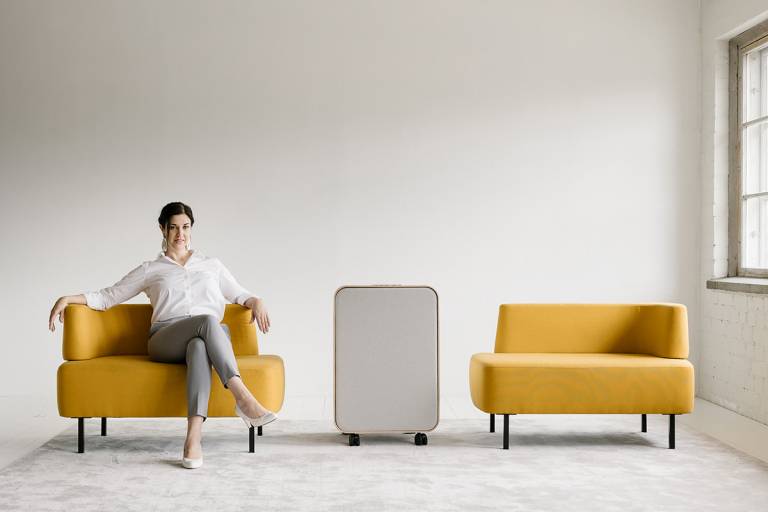 Tummatukkainen nainen istuu keltaisella nojatuolilla vaaleassa tilassa.