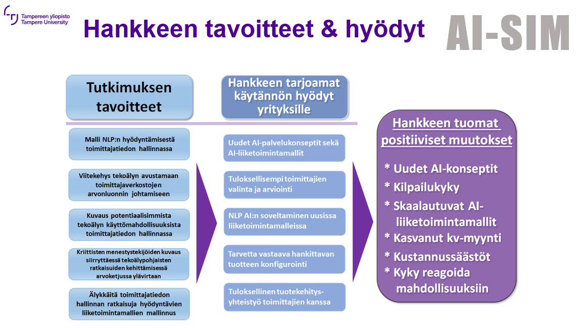 Monet AI:n hyödyntämisen näkökulmat hankinnoissa ja toimittajiin liittyvän tiedon hallinnassa ovat uusia tiedemaailmassa. Aiempi tutkimus ei vielä kata niitä erilaisia tapoja, joilla organisaatiot muuntavat uuden teknologian käytännön liiketoimintahyödyiksi ja kuinka tätä hyötyä voidaan arvioida ja mitata. Uuden älykkäämmän toimittajatiedonhallinnan myötä tarvitaan ymmärrystä siitä, miten uusia ratkaisuita käytetään erilaisissa toimintaympäristöissä ja toimittajasuhteissa. Tähän tarpeeseen käsillä oleva AI-SIM projekti tuo merkittävästi uutta, koeteltua tietoa.