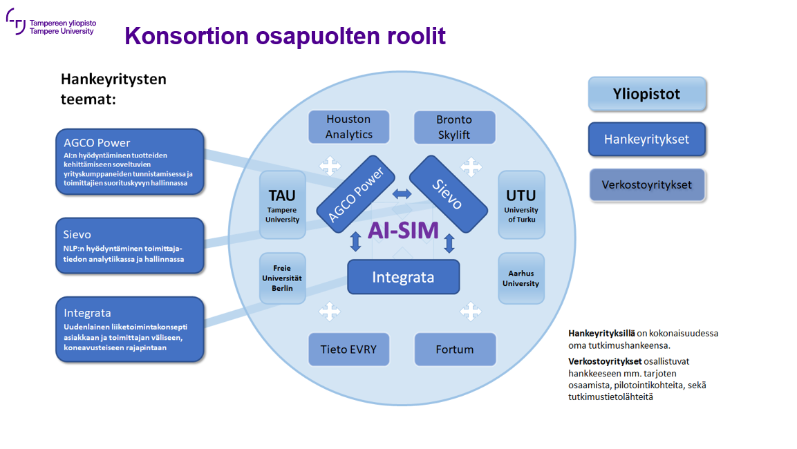 AI-SIM-hankkeen toteutus rakentuu Tampereen yliopiston tuotantotalouden yksikön ja Turun yliopiston TurkuNLP-tutkimusryhmän sekä kolmen yrityksen, AGCO Powerin, Sievon ja Integratan, tiiviin yhteistyön ympärille. AGCO Powerin roolina konsortiossa on edustaa asiakasyritystä tekoälyavusteisten ratkaisujen soveltamiseen. Sievo puolestaan edustaa kehittäjäyritystä, joka tarjoaa ja pilotoi ratkaisujaan AI-SIM verkoston yrityksille. Inregrata toimii NLP ratkaisuiden uusien liiketoimintamahdollisuuksien tutkimusalustana ja tarjoaa ymmärrystä NLP:n soveltamisesta sekä yrityksen sisäisiin että yritysten välisiin tietotarpeisiin.