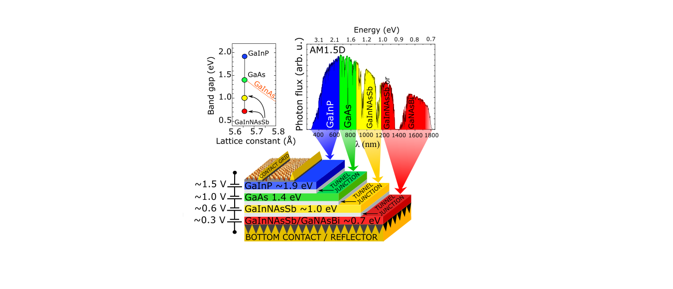 The published study titled “Wide spectral coverage (0.7–2.2 eV) lattice‐matched multijunction solar cells based on AlGaInP, AlGaAs and GaInNAsSb materials” can be found here.