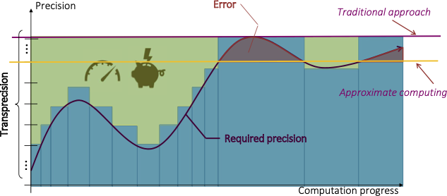Transprecision computing is a groundbreaking approach that has emerged to enhance computational efficiency. As depicted in Figure, in traditional methods, computations typically use the maximum level of precision throughout the process. However, using the highest precision in floating-point arithmetic all the time can result in increased power consumption and extended computation times, a concern for applications where energy efficiency and speed are paramount. Programs typically perform many stages of computations to produce a result, and different stages might require different levels of precision, depending on their specific needs. Therefore, selecting the right precision for each stage is essential for optimizing the program’s performance and efficiency. One of the approaches adopted to improve efficiency is Approximate Computing (AC), which is beneficial for applications that can handle some level of inexactness in their outputs. AC might involve using a single data type throughout the computation process in some scenarios, regardless of the specific requirements of different stages. While this can decrease computational cost, it might introduce errors, especially in the computation stages requiring higher precision.