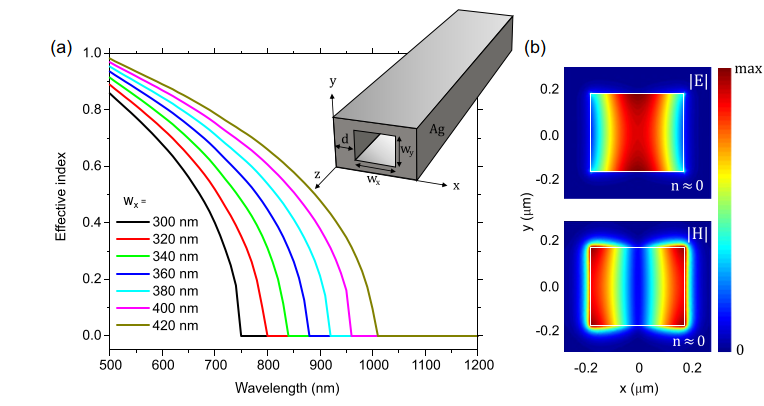 - We studied coupling between the fundamental mode of a rectangular plasmonic waveguide providing an ENZ medium at its cutoff wavelength and the localized plasmon resonance of a gold nanorod located at the center of the waveguide.