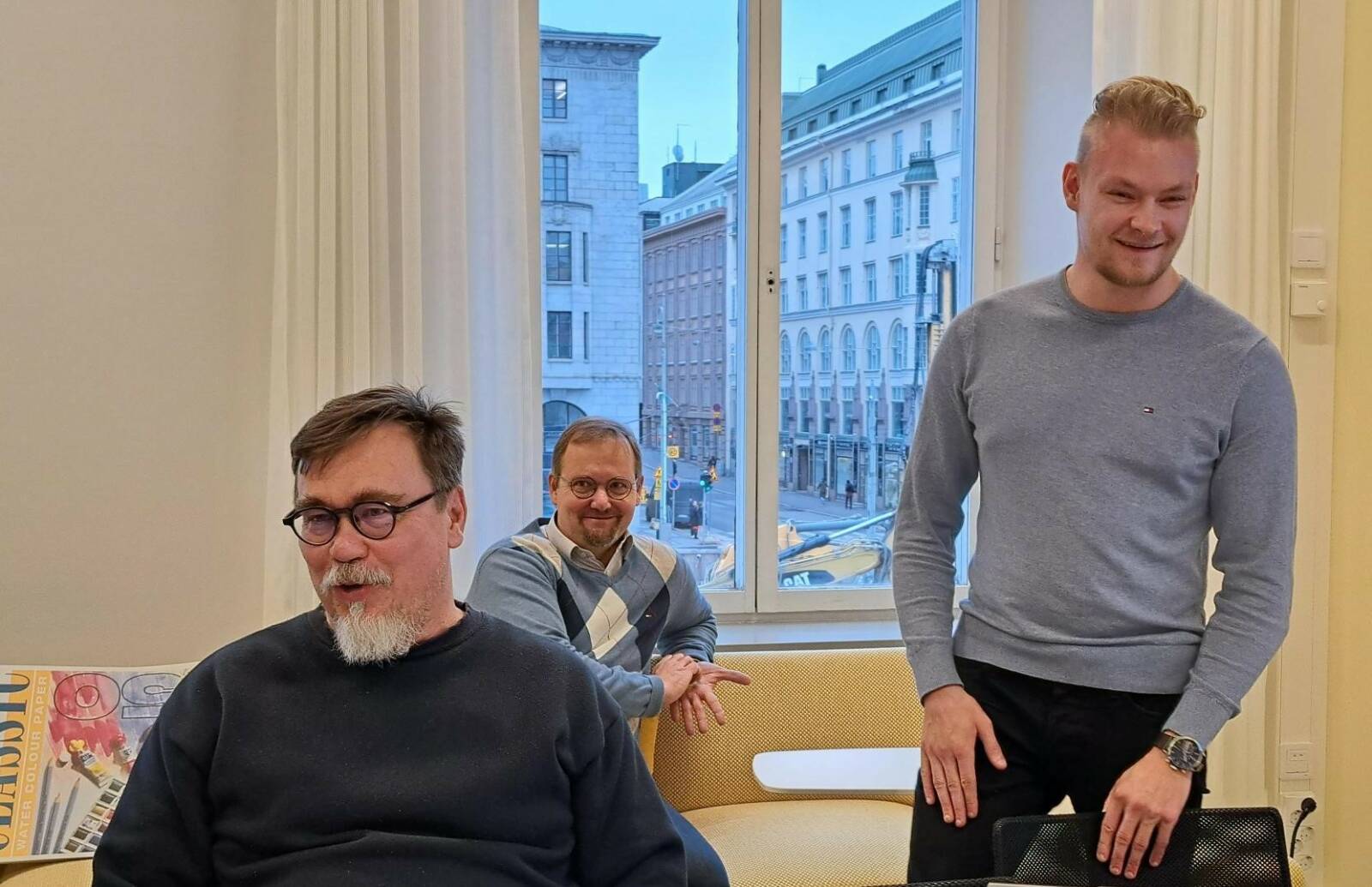 Juha-Matti Junnonen, Jukka Puhto ja Aleksi Mäkelä esittelemässä Mäkelän diplomityön tutkimussuunnitelmaa Arvo-hankkeen ohjausryhmälle Helsingissä.
