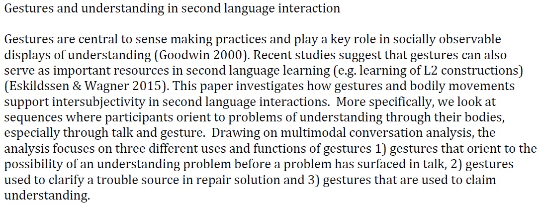 ”Gestures are central to sense making practices and play a key role in socially observable displays of understanding (Goodwin 2000). Recent studies suggest that gestures can also serve as important resources in second language learning (e.g. learning of L2 constructions) (Eskildssen & Wagner 2015). This paper investigates how gestures and bodily movements support intersubjectivity in second language interactions. More specifically, we look at sequences where participants orient to problems of understanding through their bodies, especially through talk and gesture. Drawing on multimodal conversation analysis, the analysis focuses on three different uses and functions of gestures 1) gestures that orient to the possibility of an understanding problem before a problem has surfaced in talk, 2) gestures used to clarify a trouble source in repair solution and 3) gestures that are used to claim understanding.”