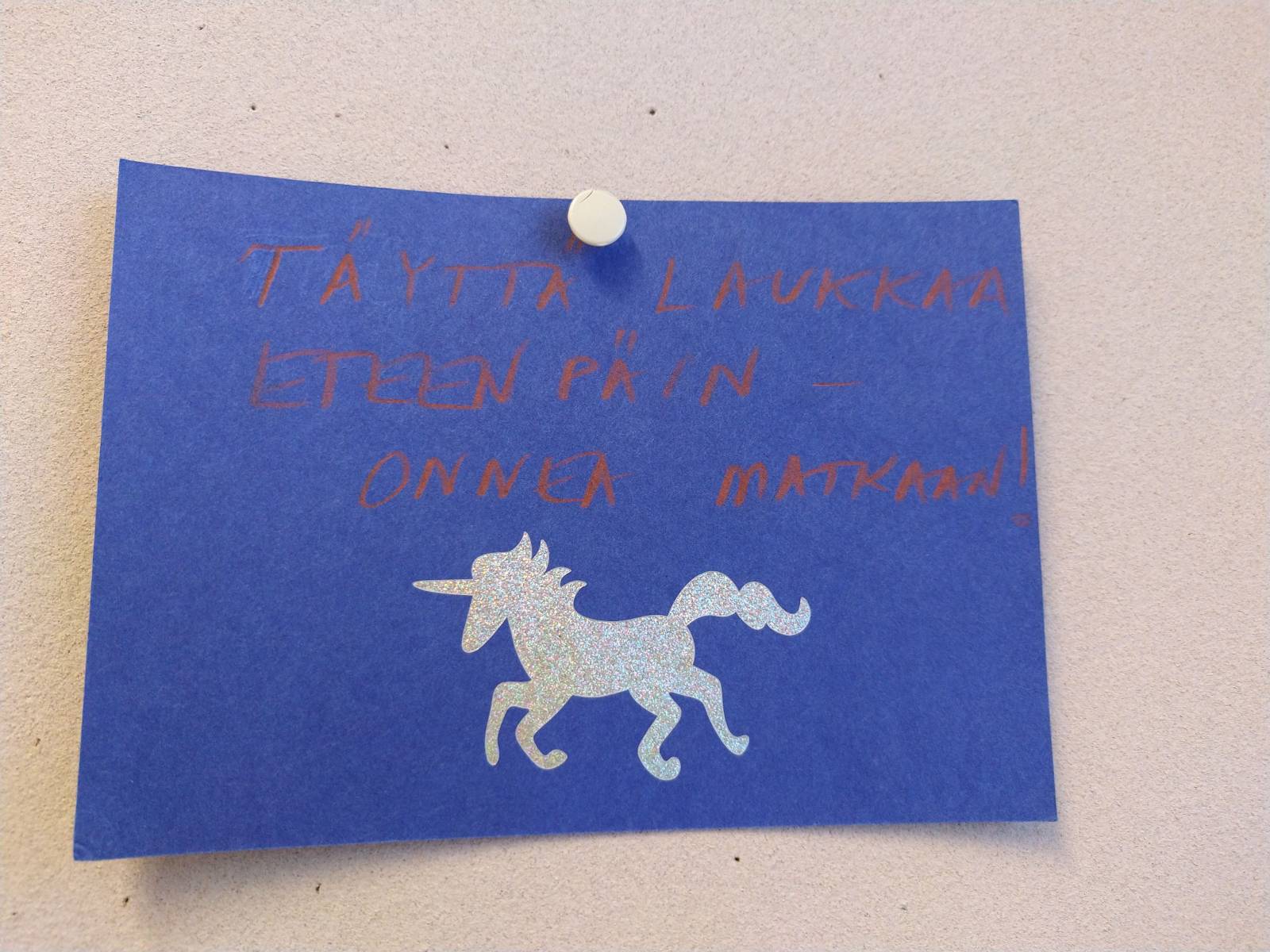 Konferenssi-illallisella tsempattiin toisia tutkijoita askartelemalla ja kirjoittamalla kortteja, jollaisen jokainen sai napata mukaan vaikkapa oman työhuoneen seinälle. Tähän tapaan: ”Täyttä laukkaa eteenpäin – onnea matkaan!”