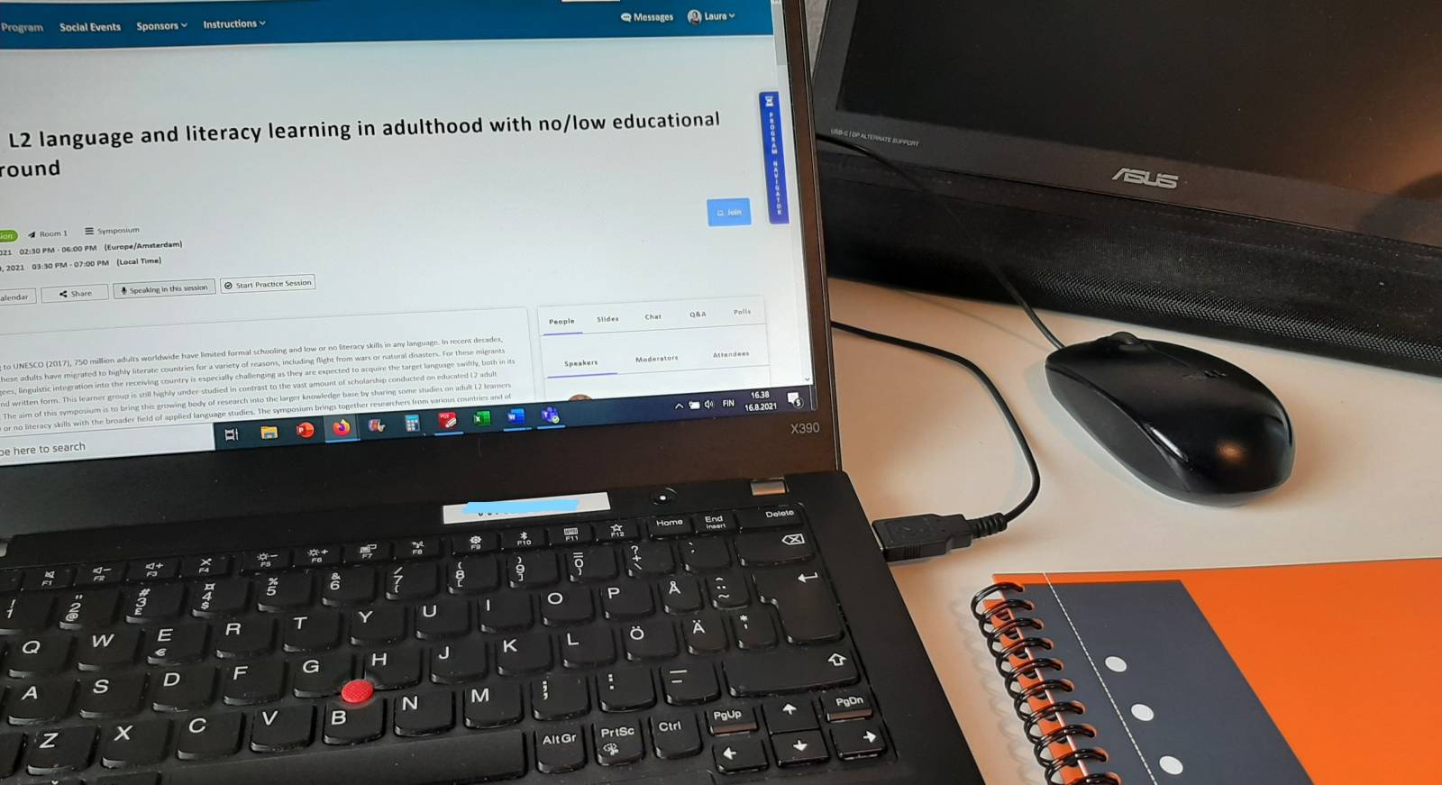 Elokuun puolivälissä Laura osallistui ensimmäistä kertaa LESLLA-konferenssiin, joka oli tänä vuonna 17th Annual LESLLA Symposium, 2021. LESLLA on maailmanlaajuinen järjestö, joka pyrkii edistämään yhtä aikaa sekä luku- ja kirjoitustaitoa että toista kieltä oppivien aikuisten asemaa, heidän opetustaan sekä heidän oppimistaan koskevaa tutkimusta. Lyhenne viittaa ilmaukseen ’Literacy Education and Second Language Learning for Adults’. Myös tässä konferenssissa esitelmä oli LESLLA-opiskelijoiden pyynnöistä. Seitsemästoista LESLLA-symposium järjetettiin Yhdysvalloista käsin ja aikaerot oli huomioitu ohjelmanteossa erittäin hyvin. LESLLA-organisaation sivuille pääsee tästä: https://www.leslla.org/
