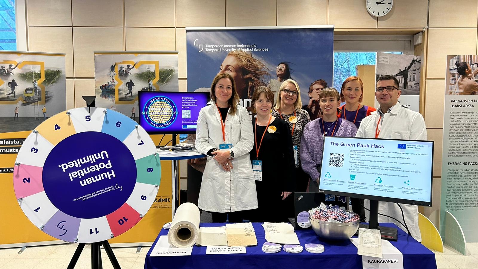 BioPak –hankketta edustettiin tapahtumassa usean korkeakoulun voimin, kun hanketiimi TAMKia, Xamkia ja OY/MITYä myöten kokoontui yhteen. Tavoitteemme oli jalkauttaa hankettamme alan toimijoiden keskuudessa, tiedottaa heitä Green Pack Hack –innovaatiokilpailusta ja tämän myötä kerätä mahdollisia osallistujia kilpailuun sekä arvokasta tietoa tutkimustyötämme varten TP2:n (työpaketti) puitteissa. Näin ollen oli ilo huomata, kuinka paljon pakkausalan ammattilaisia ja innovaatioita tapahtuma veti puoleensa. Erityisen iloisia olemme mielenkiinnosta, jota pöytämme ja projektimme herätti koko päivän ajan.