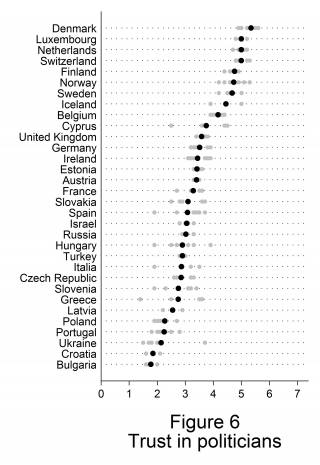 First, the variation around the mean is small for Finland compared to other countries. Second, Finland ranks high in Europe in terms of overall trust levels: 6th place for trust in parliament, 4th place for trust in parties and 5th place for trust in politicians.