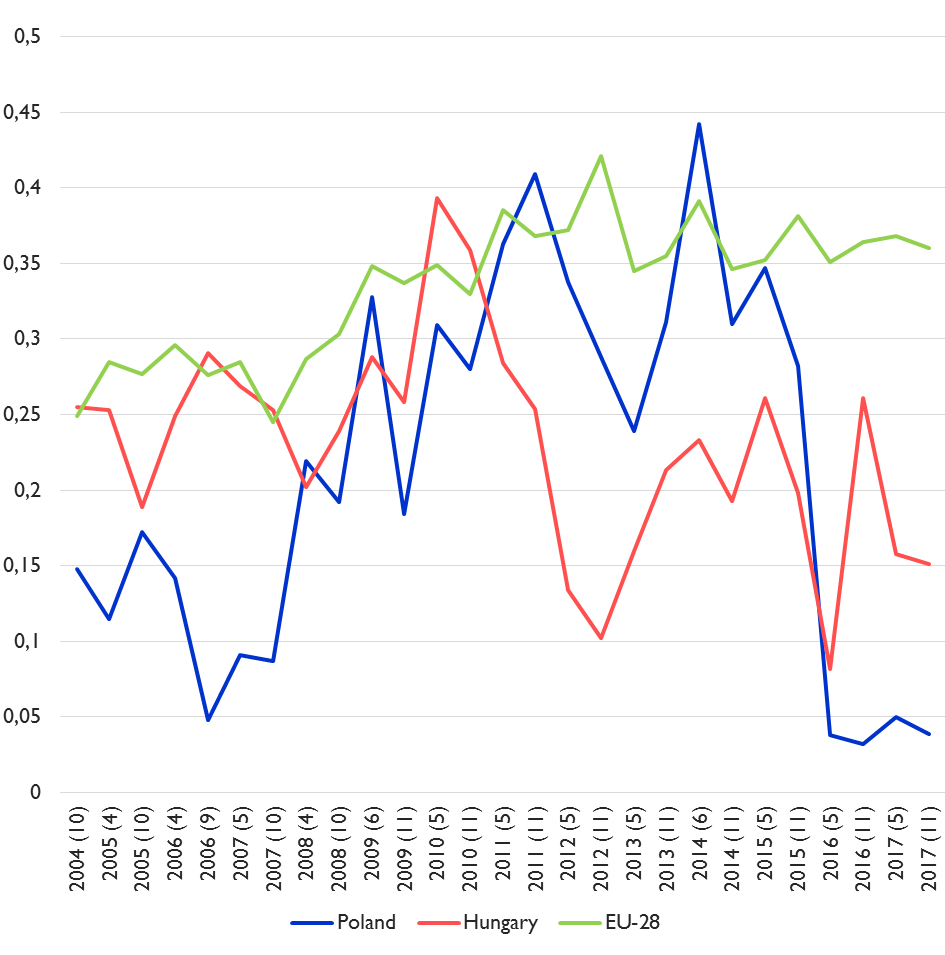 While the trends in Poland and Hungary contradict the general developments in public opinion within the EU-area, it can be concluded that the EU citizens in a majority of the Member States have become less prone to differentiate when asked to evaluate the institutions at the national and European level.