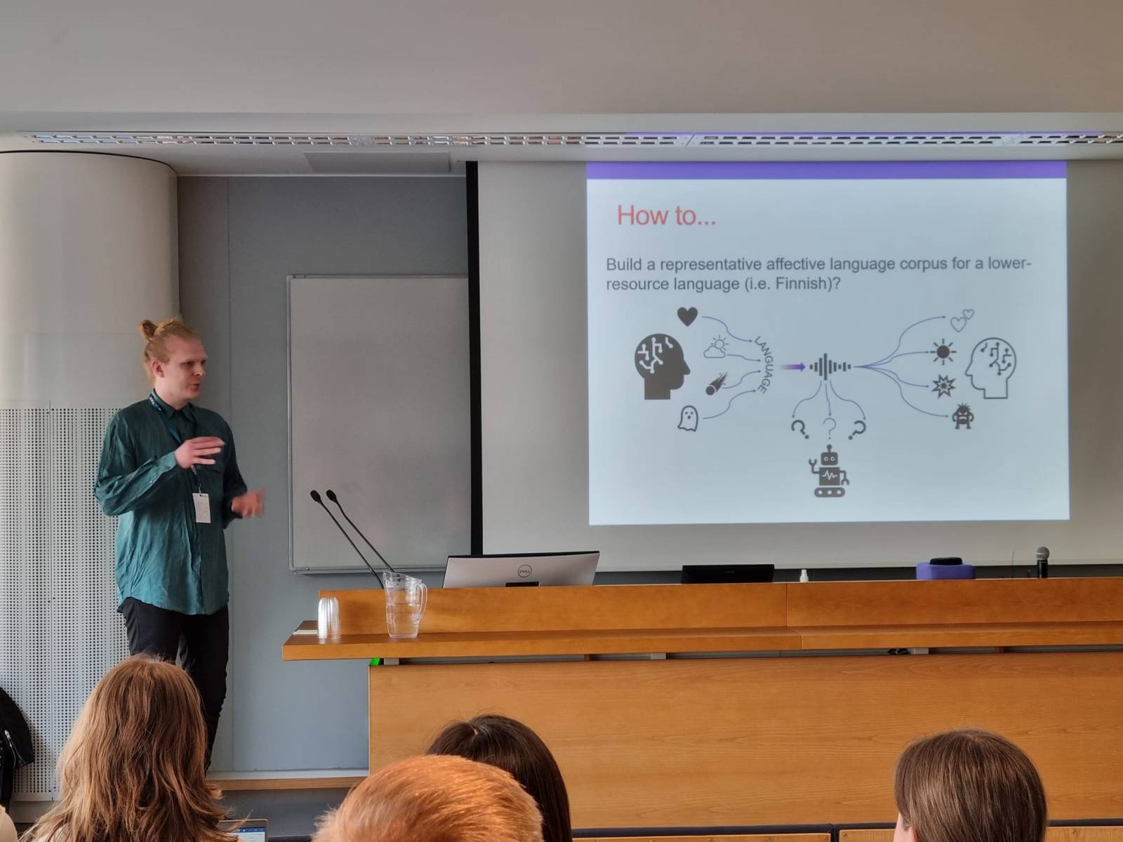 Kalle gave a presentation about the first achievements in his doctoral studies, accomplished together with Kalle’s supervisors Liisa Mustanoja and Okko Räsänen. The presentation introduced the first affective speech corpus based on spontaneous Finnish speech, giving insight into the methodologies used to sample, annotate and analyze large-scale unannotated and unscripted speech data in the context of affective language. The introduced corpus will be made public along with two (submitted) publications covering the work in detail. The corpus works as a foundation for achieving the next research goals for Kalle’s doctoral thesis.