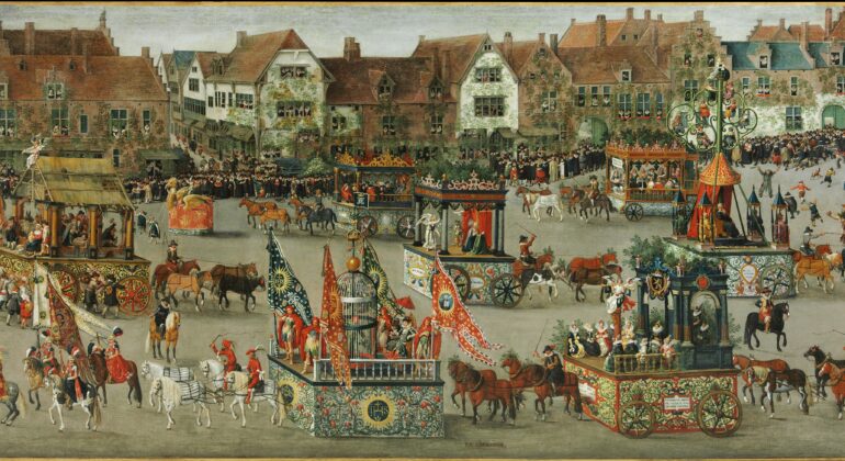 Image: Photo: Denis von Alsloot (1616), De Ommeganck in Brussel op 31 mei 1615. De triomf van aartshertogin Isabella. Oil on Canvas. Victoria and Albert Museum, London.