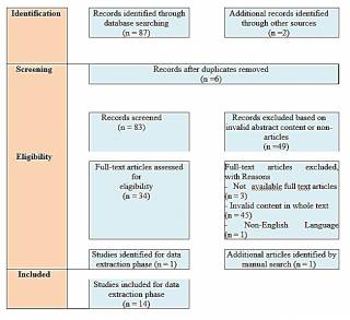 Structured literature searches were conducted using 3 databases to identify relevant studies from 2014 to 2020: PubMed or Medical Literature Analysis and Retrieval System Online, Cumulative Index to Nursing and Allied Health Literature (CINAHL), and Excerpta Medica database (EMBASE). The detailed search strategies for PubMed have been provided as an example (see Appendix 1). We found 89 literature according to our inclusion and exclusion criteria. At first, two reviewers, with subject matter and methodological expertise, independently reviewed all abstracts identified by the searches and conflicts were resolved by a third reviewer. Then, two reviewers screened the full texts to select the final studies to be included in the review. The authors also conducted a gray literature search (including conference proceedings) through a Web search engine. In addition, one articles were handpicked based on the same inclusion criteria used for articles analyzed using qualitative content analysis. The total of 14 articles were included and analyzed using qualitative content analysis.