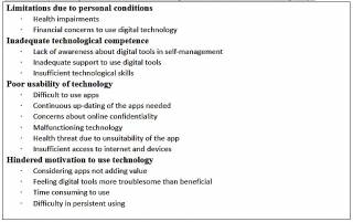 Through the analysis, four main types of barriers for self-management of chronic diseases digitally were found, such as limitations due to personal conditions, inadequate technological competence, poor usability of technology, and hindered motivation to use technology.