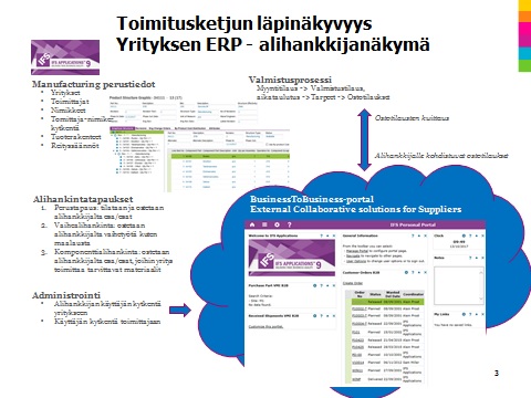 Savonian rakentamassa kehitysympäristössä simuloitiin tyypillistä toimitusketjua, jossa alihankkija toimittaa moottoripyörän kokoonpanossa tarvittavia osia. Virtuaalisen moottoripyörätehtaan toiminnanohjauksessa käytettiin IFS 9 ERP-järjestelmää ja sen työkaluja: Business Enablers-moduulin B2B-portaalia sekä IFS:n web-rajapintaa. Työkalujen käyttöönottoa edelsi ERP-järjestelmän laaja käyttöönotto sisältäen seuraavat perustiedot: yritykset, toimittajat, nimikkeet, toimittaja-nimike-kytkentä, tuoterakenteet, rakenteen nimikkeiden vaihekytkentä, reitityssäännöt ja administrointi. B2B-portaalin käyttöönoton edellytyksenä oli siis ERP:in täysimittainen käyttöönotto tuotannon näkökulmasta.