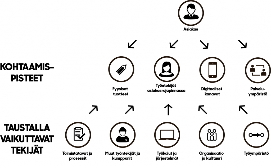 Voidaan ottaa tarkasteluun myös asiakkaalle taustalla vaikuttavat työntekijän toimet; työympäristö; organisaatio ja kulttuuri; taustalla vaikuttavat toimintatavat, prosessit ja järjestelmät. Näin pystytään kriittisesti tarkastelemaan palvelutuokioon vaikuttavia eri tekijöitä ja löytää palvelun kipupisteitä ja muotoilla halutunlainen palvelukokemus.