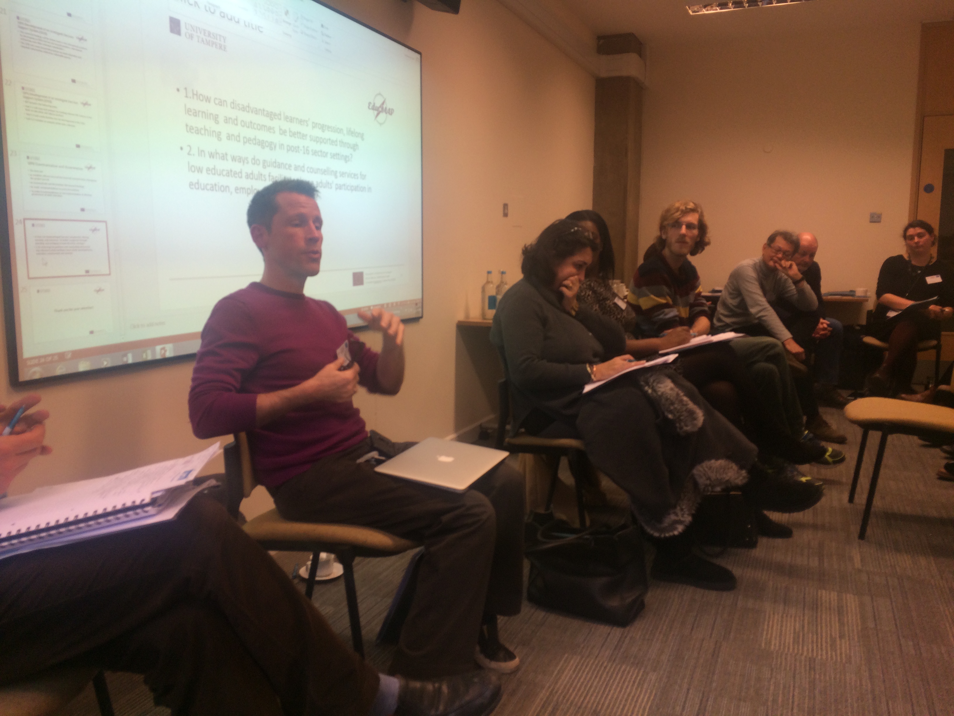 The Edumap policy-informing workshop took place on 7 December 2016 at UCL Institute of Education. The workshop was organised and disseminated through the UCL Centre for Post-14 Education and Work network. The Centre aims to improve the relationship between education, working life and active citizenship, internationally, nationally and locally. The Centre’s networking activity is nationally focused and includes more than a hundred participants, seeking to research current and future-oriented perspectives on post-14 education and its role within society. The workshop aimed to bring together a wide range of stakeholders involved with issues relating to education, training and the social inclusion of young adults. The event also aimed to receive feedback as well as to plan future research work and develop collaboration with relevant stakeholders.