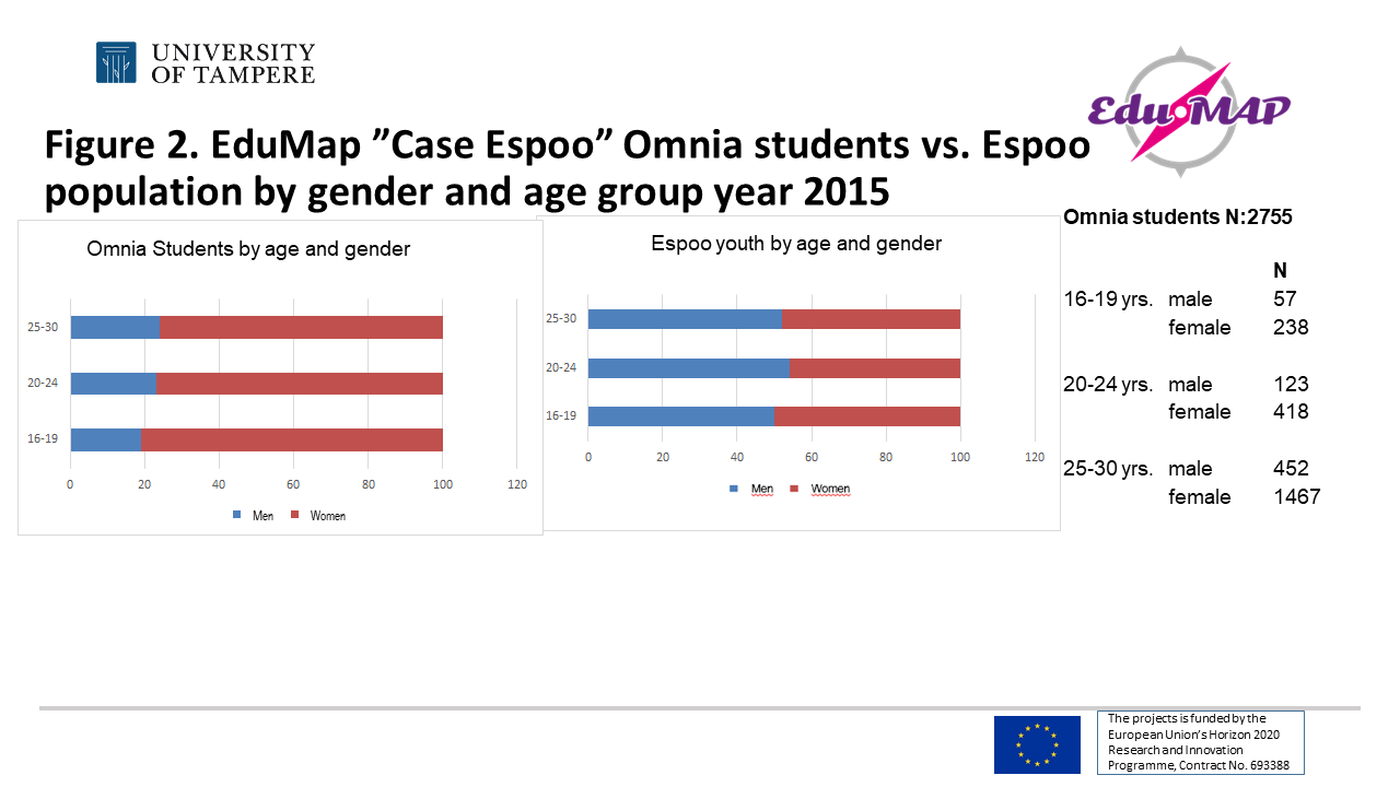 This observation led to search for such data. In cooperation with one provider of liberal AE studies (Espoo City, Omnia) we combined their client register data to EduMAP data (snapshot of the 16-30 year old population in Finland 2015, N: 993 713). The idea was to review the Espoo City population and to compare the group who participated in liberal AE studies with the corresponding age group. The figures revealed, for instance that Omnia as education provider was able to reach different language groups as the share of Finnish language students and students with another mother tongue was quite similar.