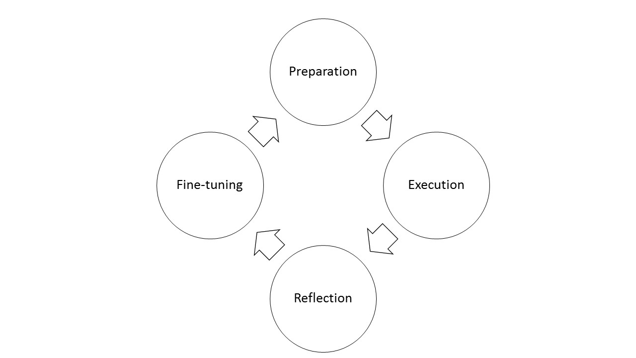 Our collaboration process is divided into four phases (very loosely inspired by Kolb’s 1984 experiential learning cycle):