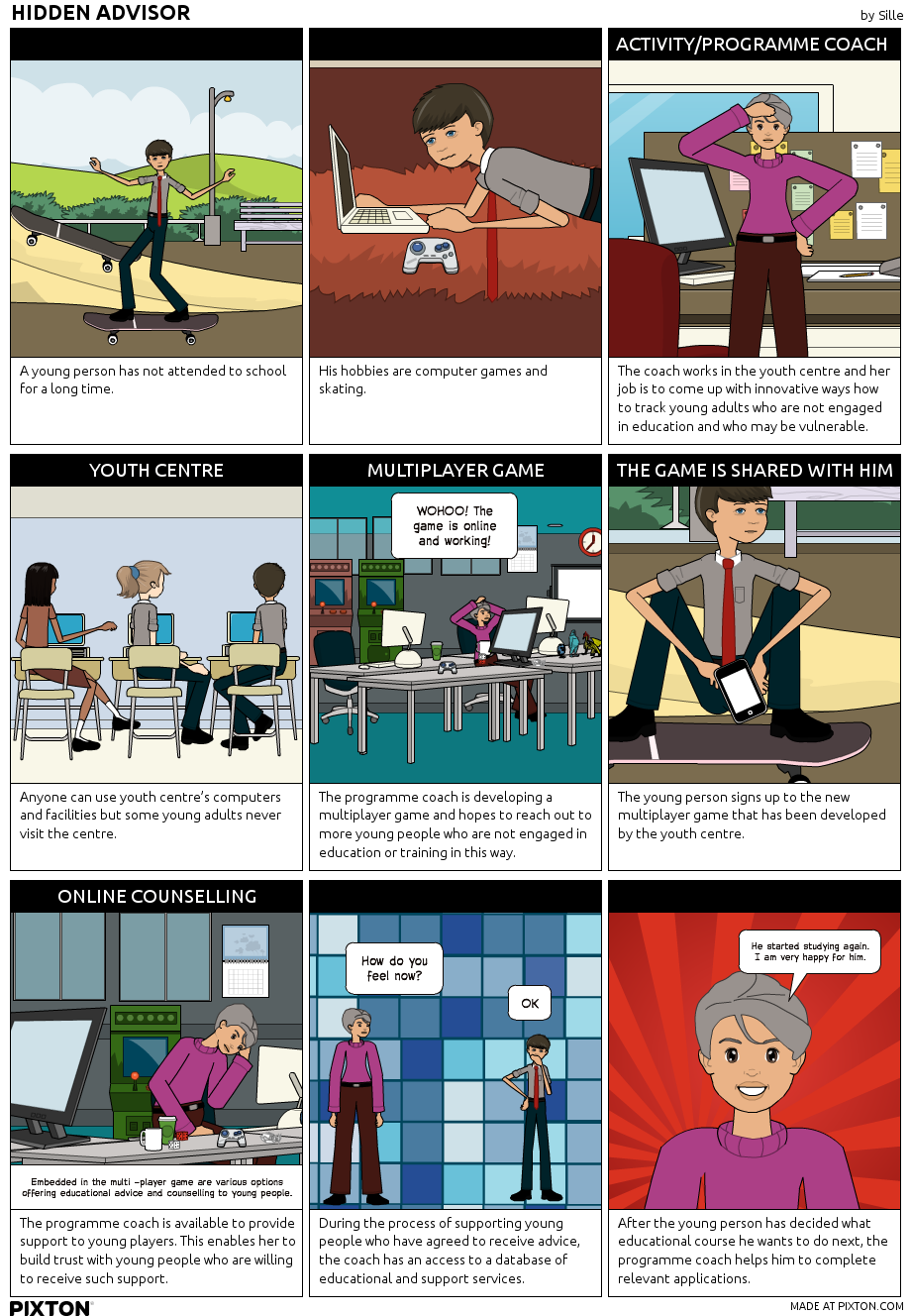 The second interaction path “Hidden advisor” depicts how the advisory practices may be embedded (hidden) into the social media environments, leveraging on the practices among young adults who spend much time in massive multiplayer computer games, at topical forum spaces or groups, or are engaged into serious games through youth centres’ project activities. Such embedded advisory practices have been reported in Finland and Estonia as a way of creating engagement opportunities for some young adults from vulnerable backgrounds. It was also considered a relevant way for first advisory interaction in Greece among young homeless people who do not like to attend social and educational guidance.