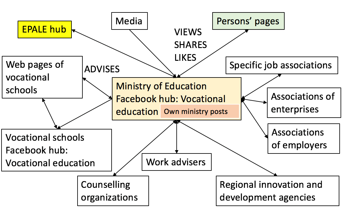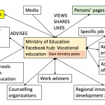 The first interaction path “Communication ecosystem with social media” depicts the overall social media based communicative ecosystem development between different stakeholder organizations and places for secondary information sharing and for increasing the visibility of information about adult education opportunities. This approach enables distributed access to information that is shared in a self-organized manner across the dynamically evolving communicative ecosystem that provides the social media layer. Such information orchestration may support the stakeholder organizations, as well as attract young adults. This practice was more common in countries like UK, Finland and Estonia, while the general trend based on EduMAP case studies is that young adults with NEET, migrant or other vulnerable background with low digital literacy do not utilise such social media channels that the AE and supportive organizations provide.