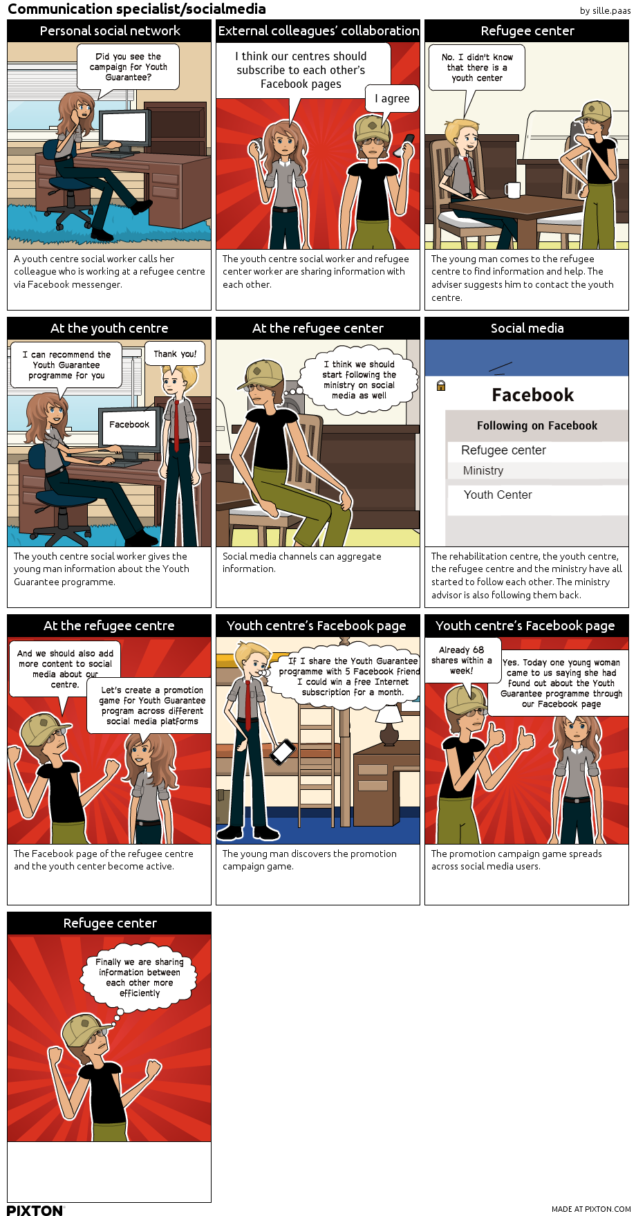 Other important roles are those of advisors, communication specialists and educators. In a regional communicative ecosystem, several complementary roles may be needed to support different young adults in vulnerable situations. The orchestrated handling of information, media, and social layers must be achieved between the advisors, communication specialists and educators.