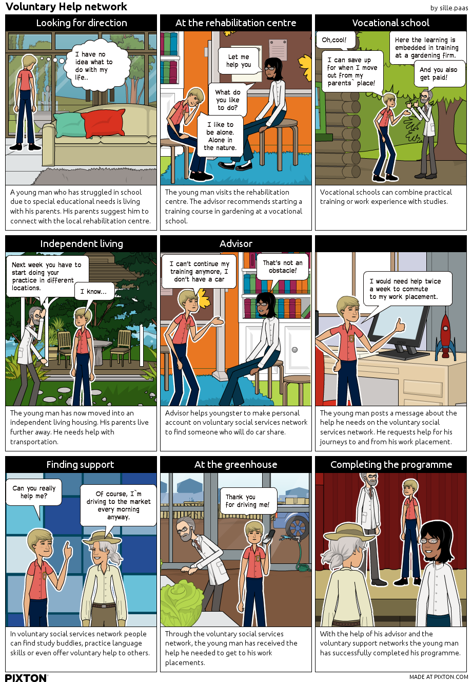 The fifth interaction path “Voluntary help network” was inspired by the emerging social help and sharing economy services that could also be repurposed for providing missing supportive services for young adults to promote their access to AE. In this case, Helpific‘s example was used. The organization provides access to voluntary help networks for finding temporary help, learning buddies, shared transport opportunities etc. for vulnerable people from all age groups. The help is mainly provided free of charge. Helpific has also piloted the interaction path between the people in need, the advisors, and the voluntary helpers. This interaction scenario promotes active citizenship competences among all people taking part, and among vulnerable people themselves, enabling them to offer help to others, such as babysitting, language help, study buddy etc.