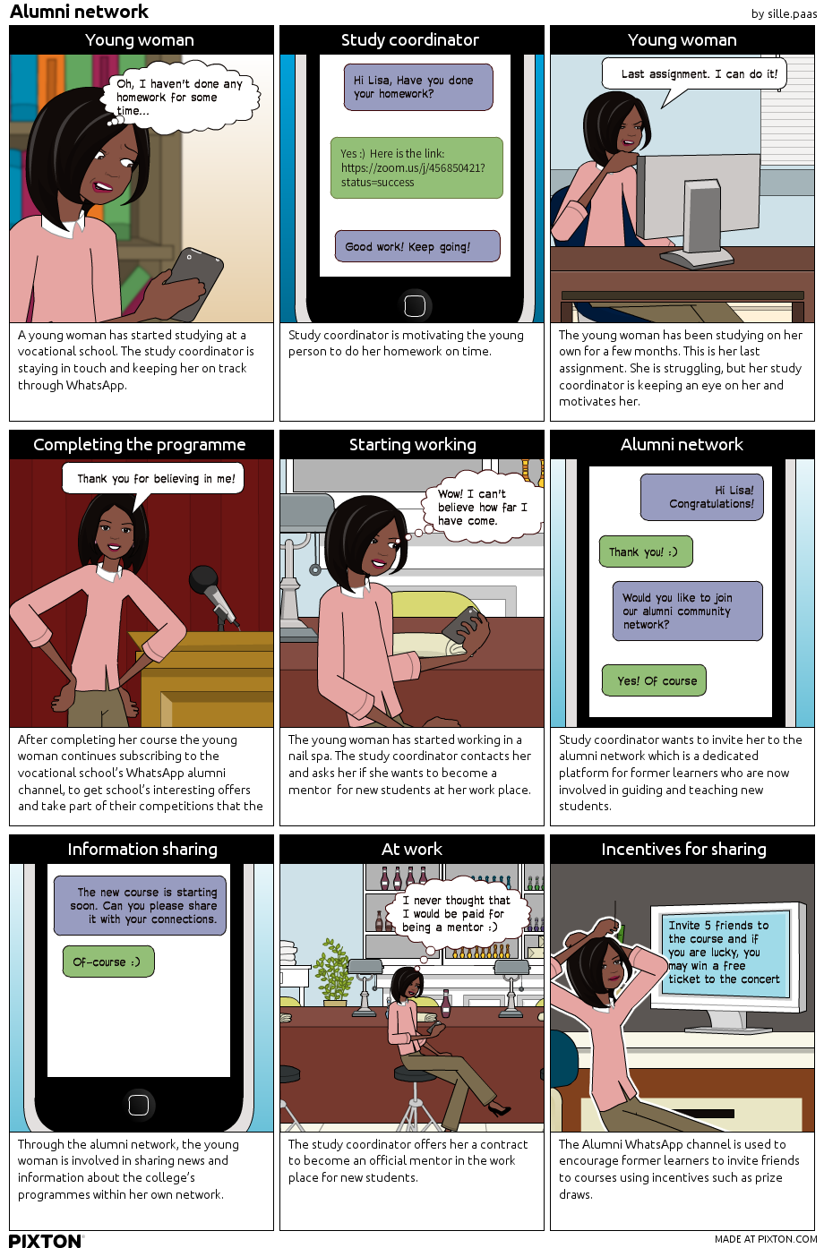 The sixth interaction path “WhatsApp learning group” depicts the emerging educational practices to use social media channels like WhatsApp, Facebook groups or Instagram as digital learning environments for sharing learning resources, tasks, and providing support. The practice was found for example in Austria, Finland, Germany and Turkey. We propose leveraging on that practice to reuse the study groups after graduation as alumni networks.