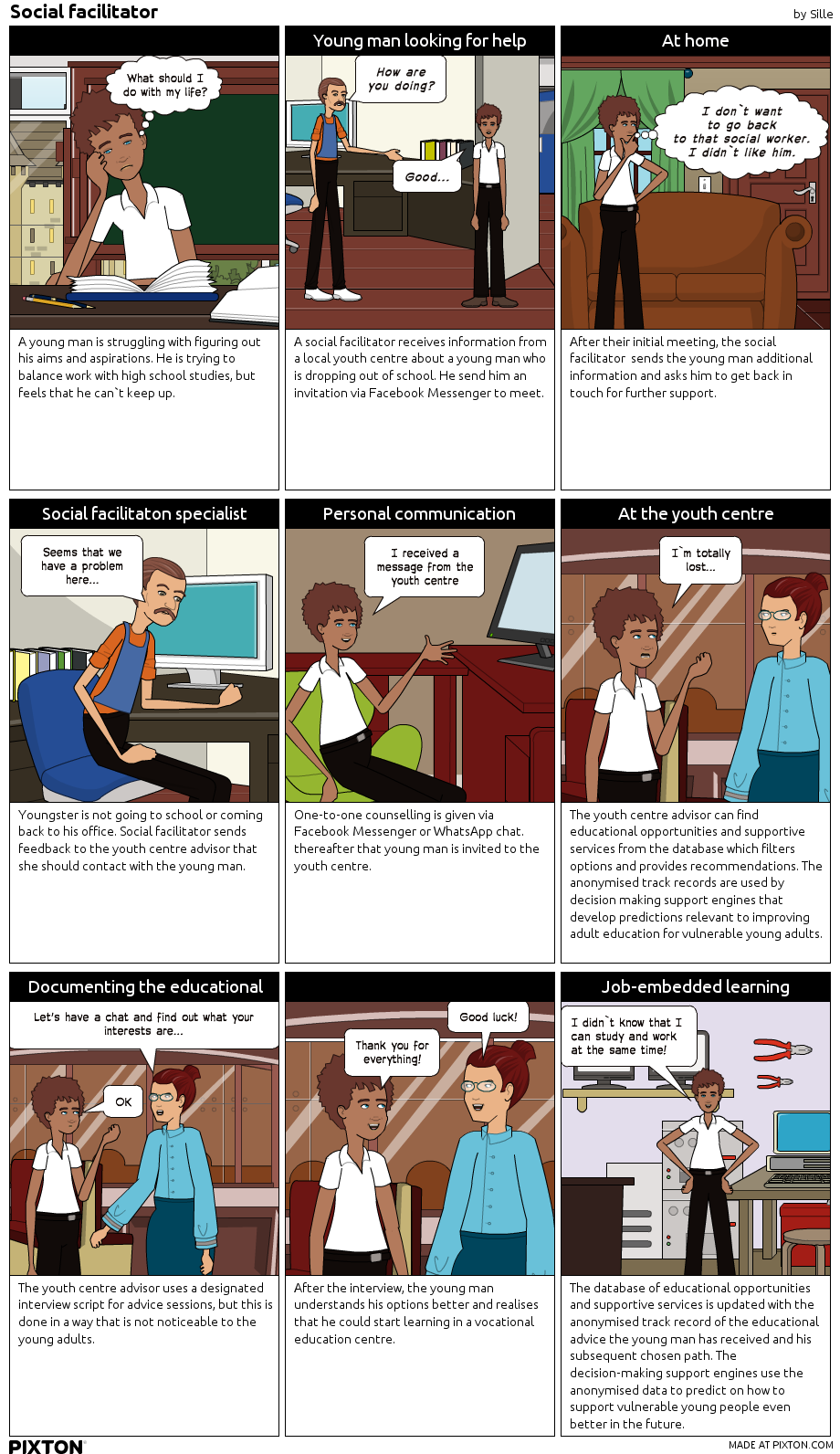 The third interaction path “Social facilitator” leverages on the existing advisory practices in different stakeholder organizations, and proposes that advisory engagement in initial stages could be partially conducted using social media channels. This interaction opportunity builds on the finding that advisors were the main information source for young adults with vulnerable background to get to know and access adult education opportunities. The advisory practice as a leverage was common across EduMAP communicative ecology cases.