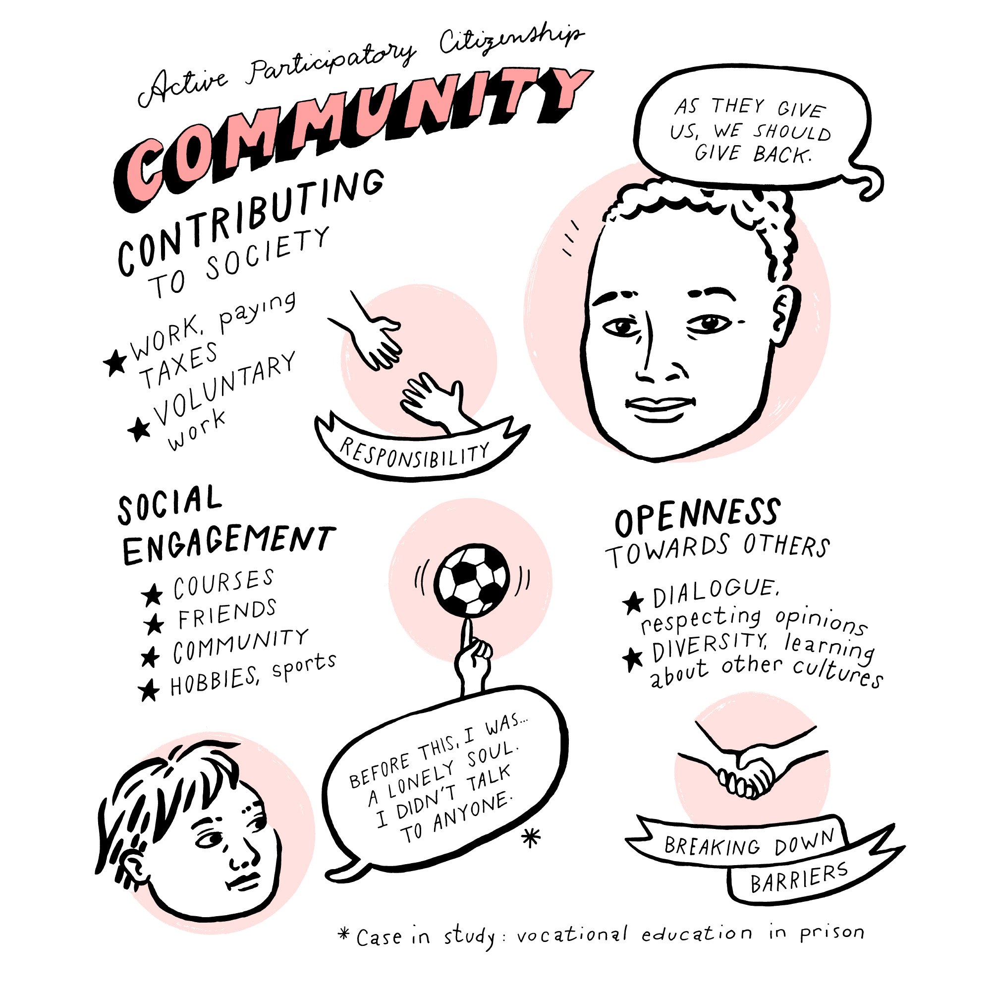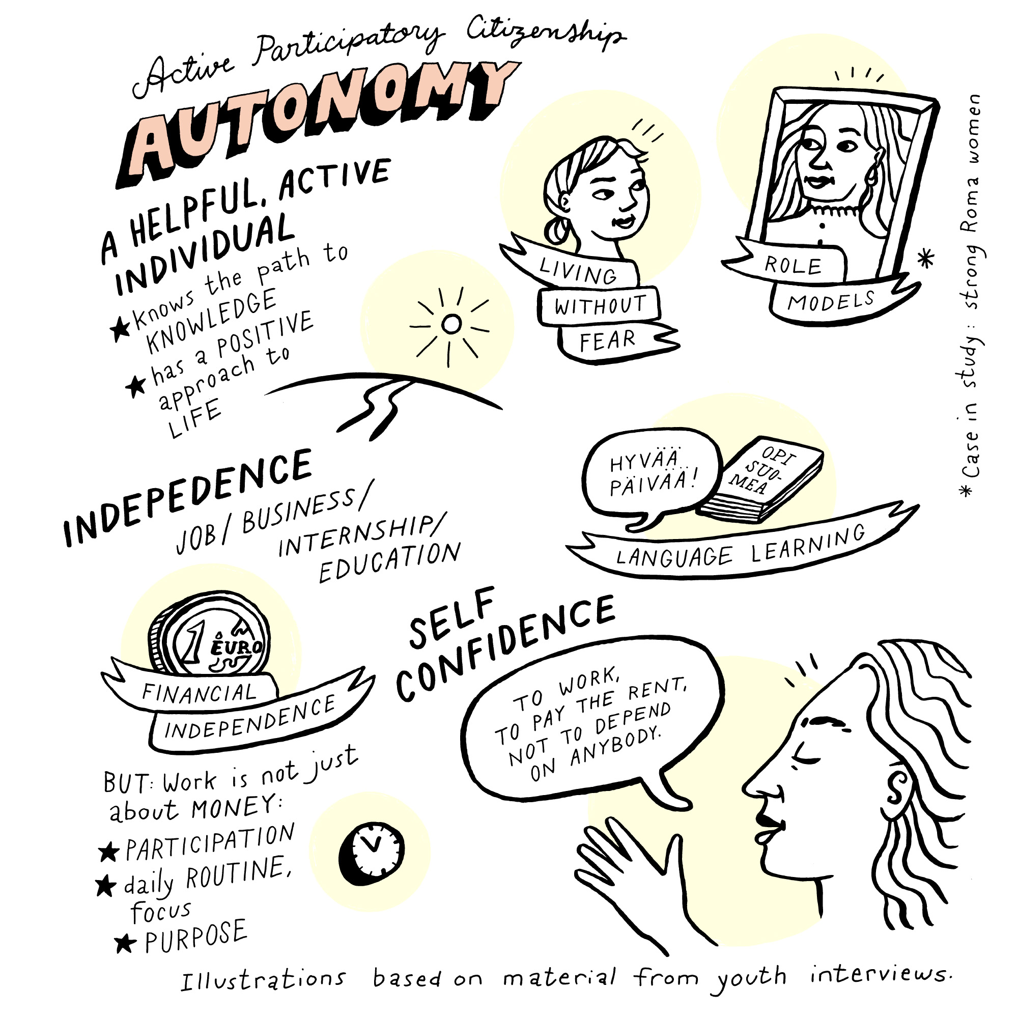 The full report, Good Practices in Adult Education Programmes for Young People in Vulnerable Situations, will soon be published. Meanwhile, we would like to share illustrations based on young people’s understanding of active participatory citizenship. All illustrations by Aino Sutinen. Click on the images to enlarge!