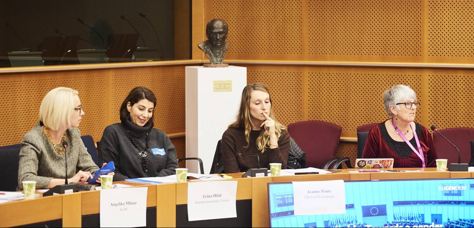 The four prominent participants included MEP Angelika Mlinar (ALDE), MEP Julie Ward (S&D), Project Manager Zeina Hilal (IPU), and Jeanne Ponte (Founder of the #MeTooEP campaign).