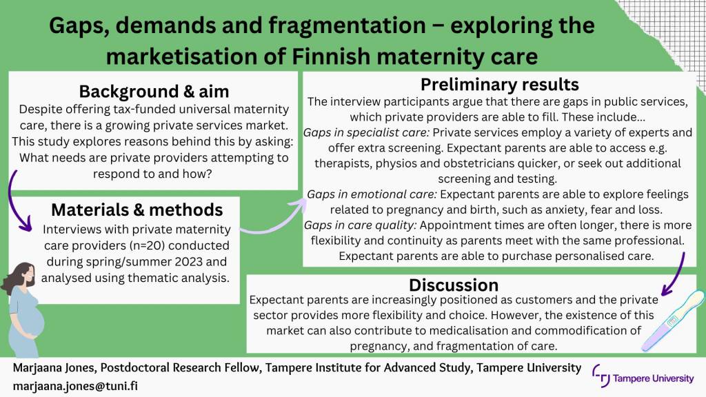 Tässä kuussa on kulunut vuosi siitä, kun sain eettisen toimikunnan puoltavan lausunnon ja pääsin aloittamaan projektin aineistonkeruun. Vuoden alkupuolella otin yhteyttä ensimmäisiin raskausajan palveluja tarjoaviin yrittäjiin ja siitä koko Suomen kattava haasattelukierros lähti sitten liikkeelle. Olen haastatteluja tehdessä päässyt tapaamaan useita raskausajan hoitoon sekä synnytykseen intohimoisesti suhtautuvia ammattilaisia. Oma käsitys palvelukentästä on jatkuvasti laajentunut sekä monipuolistunut. Kesällä 2023 pääsin myös tekemään ensimmäisiä haastatteluja julkisissa neuvoloissa ja nämä jatkuvat heti vuoden vaihteen jälkeen, kun olen saanut tutkimusluvat hoidettua kuntoon hyvinvointialueiden kanssa.