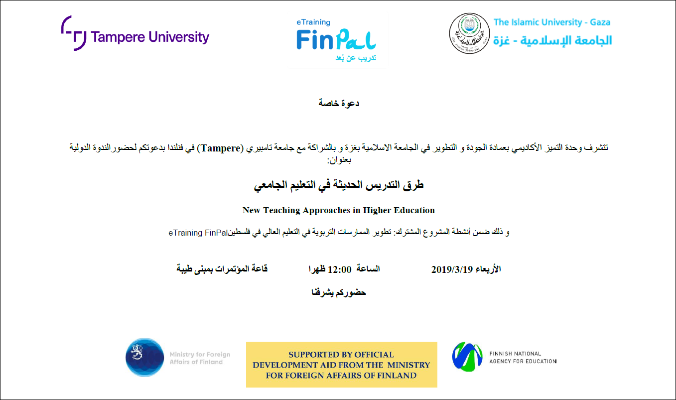 Welcome to the International Symposium at IUG on 19 March at 12:00 (Conference hall). The symposium is organised by the Academic Excellence Unit and Quality and Development Deanship at Islamic University of Gaza in cooperation with Tampere University, Finland. The symposium theme: New Teaching Approaches in Higher Education.