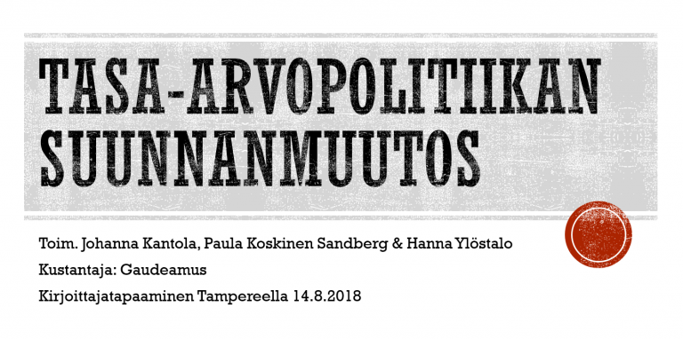 Tasa-arvopolitiikan suunnanmuutos -kirjan kirjoittajatapaaminen Tampereella 20.8.2018 seminaari tapahtuma tasa-arvopolitiikan suunnanmuutos tutkimus uutinen