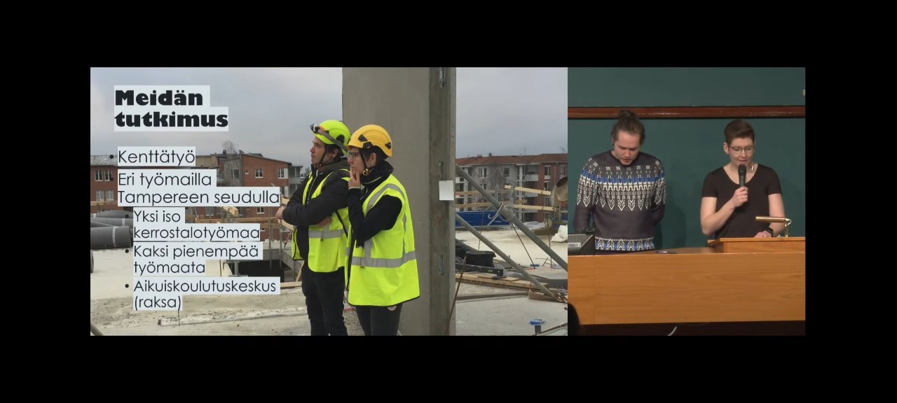 Joona Poikonen ja Nathalie Schümchen Tampereen yliopistosta esittelivät projektin, joka käsittelee työntekijöiden välistä vuorovaikutusta rakennustyömaalla. Kenttätyötä tehdessään projektin tutkijat huomasivat heti, että kieltä käytetään paljon ja moneen eri asiaan, vaikka voisi kuvitella toisin. Rakennustyön vuorovaikutusta on puhutun kielen lisäksi tekstit eri muodoissa. Rakennustyömaalla tekstit näkyvät esimerkiksi erilaisina lippuina ja lappuina. Teksteissä näkyy myös rakennustyön monikielisyys, sillä ne sisältävät yleensä suomen lisäksi englantia. Niissä voi olla myös huumoria ja dialogisuutta, kun seuraava työntekijä lisää lappuun lisää tekstiä.