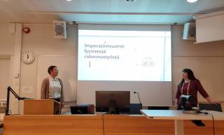 Esittelimme konferenssissa myös meneillään olevaa tutkimustamme rakennusalan työtilanteissa käytettävistä direktiivivuoroista – tällä kertaa erityisesti imperatiiveista. Imperatiivit ovat raksalla taajaan käytössä: alustavien havaintojemme mukaan niillä koordinoidaan etenkin meneillään olevien fyysisten ja manuaalisten työtehtävien etenemistä.