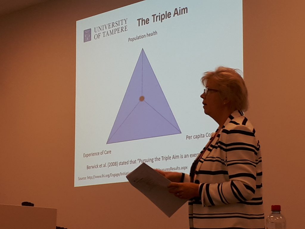 Petra Kokko gave a presentation on the hybridity in health care organizations. In particular, she discussed value-based health care and the problem of ‘triple aim’ metrics in the context of health care policies and organizations. The triple aim is one good example of the attempts through which the multi-faceted characteristics of health care could be analyzed and measured. As always, the approach involves potential rationalities, but also lots of limitations.