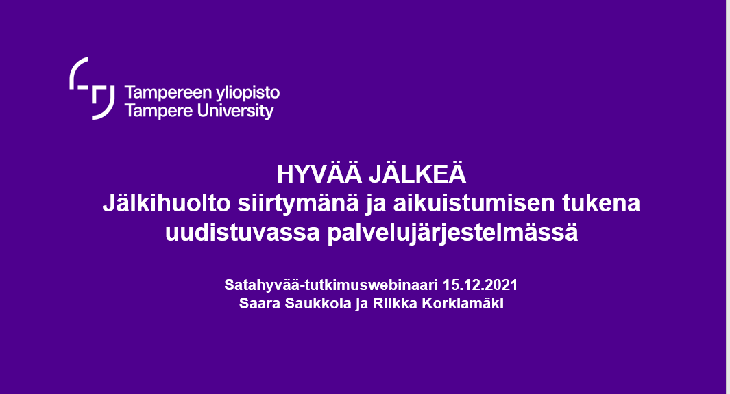 Tampereen yliopiston Porin yksikön apulaisprofessori Riikka Korkiamäki ja Tampereen yliopiston tutkija Saara Saukkola esittelivät Satahyvää-webinaarissa Hyvää jälkeä -tutkimushanketta.