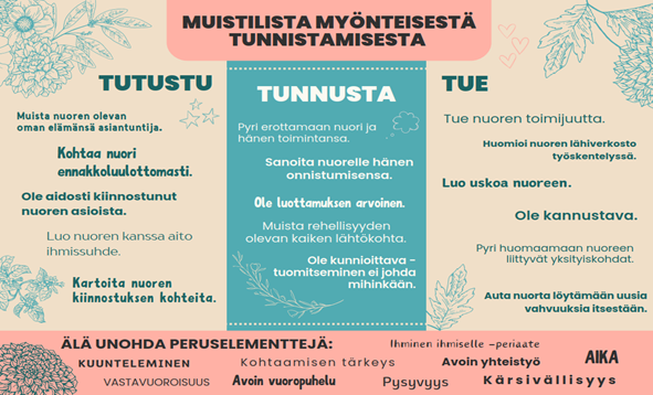 Kehittämispajoissa käsiteltiin toiminnallisten menetelmien avulla kokemusasiantuntijoiden ja jälkihuollon ohjaajien näkemyksiä myönteisen tunnistamisen elementeistä ja niiden toteutumisesta jälkihuollon työssä. Kehittämispajojen tuloksena syntyi muistilista myönteisen tunnistamisen elementeistä nuoren ja työntekijän vuorovaikutussuhteen eri vaiheissa: tutustuminen, tunnustaminen ja tukeminen. Alkuperäinen muistilista sekä kuvaus sitä taustoittavasta työstä on luettavissa Myönteinen tunnistaminen jälkihuollon työskentelyorientaationa. Oheinen muistilista on muokattu alkuperäisestä huomioiden myönteisen tunnistamisen ulottuvuudet: tutustuminen, tunnustaminen, tukeminen (ks. Kallio, Häkli & Korkiamäki 2015).