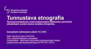 Hyvää jälkeä -hankkeen tutkijat Tarja Vierula ja Saara Saukkola puhuivat aiheesta Tunnustava etnografia – Tunnustussuhdeteoriat osana lastensuojelun jälkihuollon palveluihin oikeutettujen nuorten kanssa tuotettua etnografiaa. Vierulan ja Saukkolan esitys kuultiin Suvi Holmbergin ja Henni Alavan vetämässä työryhmässä Etnografia ja kuormittavien elämäntilanteiden tutkimus (työryhmä 13).
