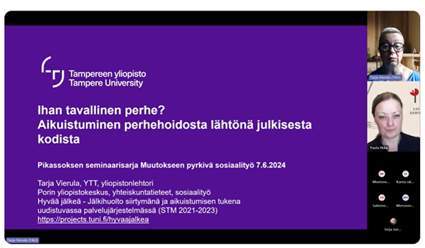 Tarja Vierula piti 7.6.2024 kommenttipuheenvuoron Pikassoksen Muutokseen pyrkivä sosiaalityö -webinaarissa teemalla Ihan tavallinen perhe? Aikuistuminen perhehoidosta. Aluksi Pesäpuun Paula Ilkka kertoo aiheesta perhehoitajan näkökulmasta, jonka jälkeen on Tarja Vierulan kommentoiva tutkimuksellinen puheenvuoro.