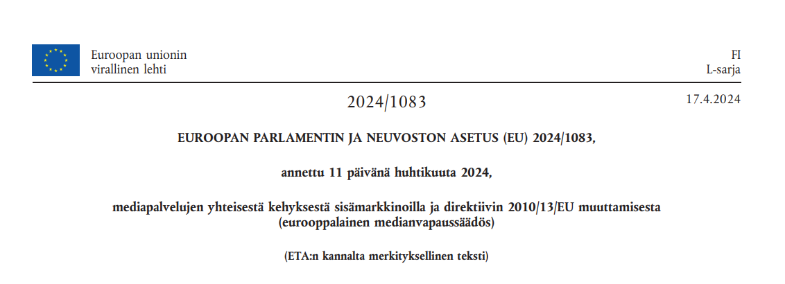 Juhannuksen alla, vähän ennen kesälomaansa, eduskunta hyväksyi uuden lain mediamarkkinoiden valvonnasta. Meillä laki on näkyvin merkki siitä, kuinka viime vuoden keväällä hyväksytty eurooppalainen medianvapaussäädös (EMFA) vaikuttaa kansalliseen sääntelyyn. Tosin EMFAn vaatimukset heijastuivat myös samaan aikaan hyväksyttyyn Yle-lain muutokseen.