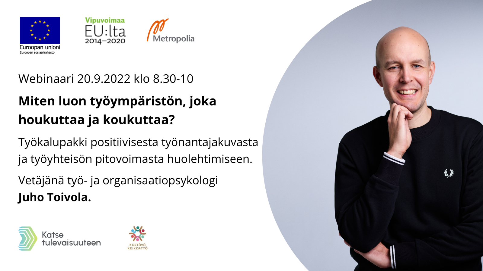 Miten luon työympäristön, joka houkuttaa ja koukuttaa? Webinaari 20.9.2022. Webinaarissa saat työkaluja pienyrityksen työnantajamielikuvan kirkastamiseen, rekrytointihaasteiden ratkomiseen ja henkilöstön pitovoimasta huolehtimiseen. Keskustelussa painotetaan erityisesti pienyritysten arkeen sopivia keinoja. Tilaisuuden vetää työ- ja organisaatiopsykologi Juho Toivola. Tilaisuus järjestettiin yhteistyössä Katse tulevaisuuteen -ESR-hankkeen kanssa.
