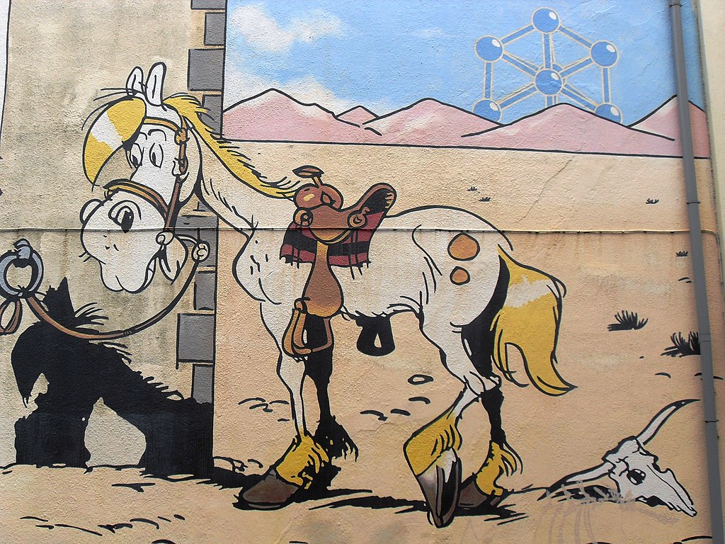 Kuva: Lucky Luke -aiheinen muraalimaalaus Brysselissä. Wikimedia Commons.