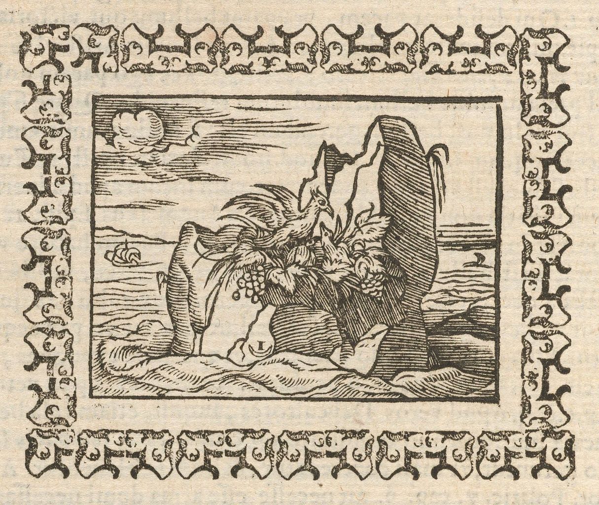 Kuva: Kuvitusta Andrea Alciaton embleemien kirjaan, Pariisi, 1583 (Houghton Library). Kuvassa mahdollinen jäälinnun pesä ja lintuun liitetty kuvateksti: ”Ex pace ubertas”. Wikimedia commons.