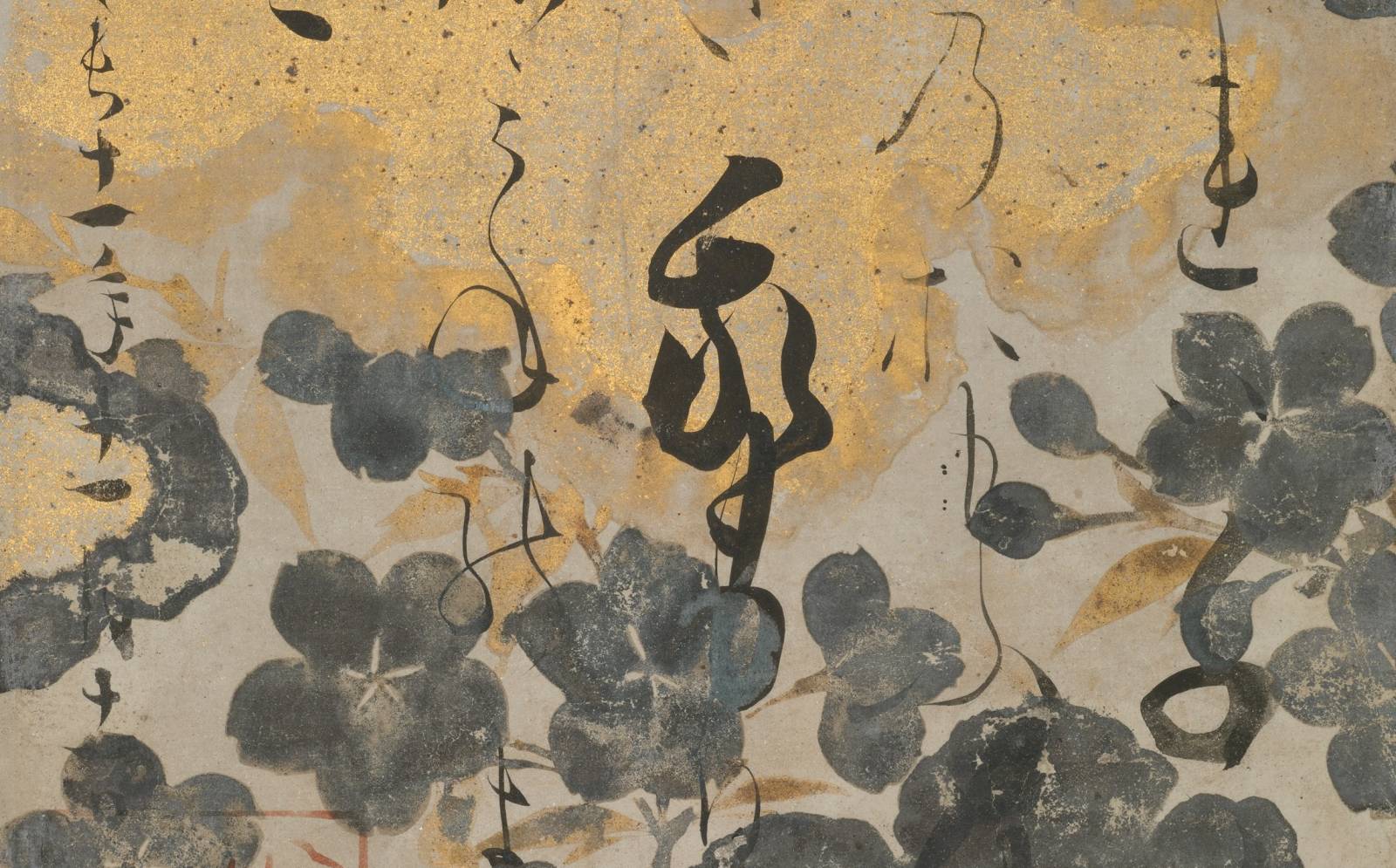 Kuva: Yksityiskohta Kamo no Chōmein runon sisältävästä kakejiku-kääröstä; kalligrafia Hon’ami Koetsu, maalaus Tawaraya Sotatsu, 1606. Wikimedia Commons.