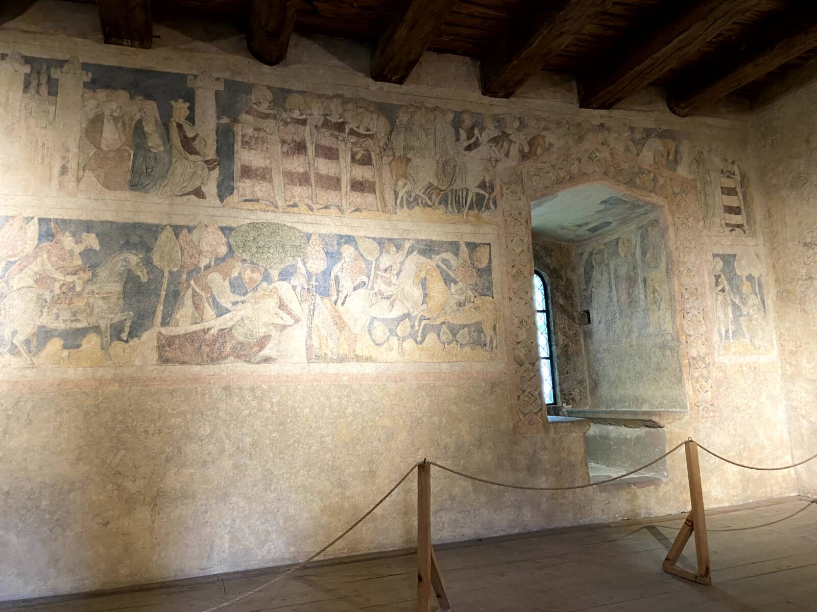 Tänä päivänä seinämaalaukset muistuttavat vuosisatojen painosta. Salissa käydyt keskustelut ovat vaienneet, aika on kuluttanut pois rakastavaisten kasvot. Varjoni piirtyy maalausten väliin, liikkuu ritarien kanssa metsässä ja sulautuu heihin edetessäni seinän viertä pitkin kohti salin päätyä. ”So sad, so fresh, the days that are no more”, kirjoitti kuningas Arthurin taruakin tuotannossaan käsitellyt Alfred Tennyson runossaan ”Tears, Idle Tears” (1847). Syyspeltoja katselevan runoilijan silmiin nousevat odottamatta kyyneleet, kun hän tiedostaa menneisyyden samanaikaisen läsnä- ja poissaolon: muinaiset päivät ovat aivan tässä, lähellä, polttavina kuin tuonpuoleisesta palaavan laivan purjeella kimmeltävä auringonsäde, ja silti niin kaukana, tavoittamattomissa kuin iltaruskon punaama, horisontin taa katoava laiva. Tennysonin sanat konkretisoituvat tornin hiljaisuudessa. Missä oikeastaan on ”keskiaika”? Näissä materiaalisissa ajan jäljissä? Ihmisissä, heissä, joille meidän keskiaikamme oli elävä, kirkas nykyhetki, jotka klassisten auktoreiden viisautta vaaliessaan hahmottivat ajankohtaisuuden paljon avarammalla perspektiivillä kuin innovaatioita ylistävä nykyaika, kuin mitä vähättelevä ilmauksemme kahden suuren ajanjakson, antiikin ja renessanssin, keskelle valahtavasta välivaiheesta antaa ymmärtää?